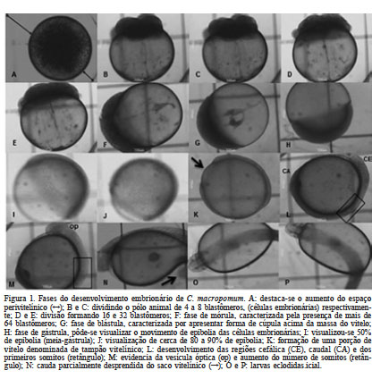 Para o acompanhamento do desenvolvimento embrionário, amostras de ovos foram periodicamente removidos das incubadoras com auxílio de uma pipeta graduada e foram depositados em lâmina milimetrada. Na primeira hora após a fertilização, as observações foram feitas a cada 10min, e posteriormente a cada 30min, até a eclosão dos ovos. As observações e as capturas das imagens foram realizadas em estereomicroscópio trinocular acoplado à câmera digital. A câmera digital foi programada para capturar as imagens de 30 em 30s até o momento de eclosão das larvas que ocorreu com 12h 54min após a fertilização.