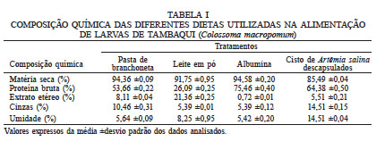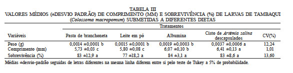 Foram observadas diferenças significativas (P<0,05) entre os diferentes tratamentos para o peso e comprimento das larvas de tambaqui. Os valores médios de peso (g), comprimento (mm) e sobrevivência (%) das larvas de tambaqui submetidas a diferentes dietas estão apresentados na Tabela III.