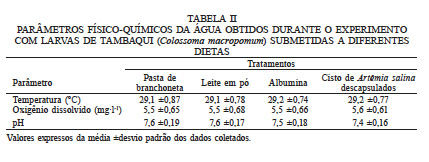Os valores médios para as variáveis físico-químicas da água obtidos no período experimental (Tabela II) estiveram dentro dos limites considerados satisfatórios para a criação da espécie.