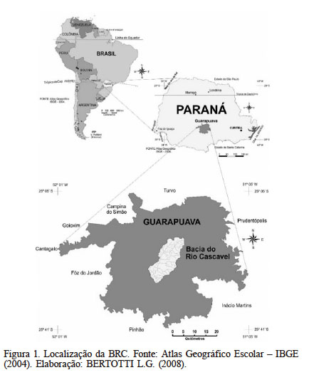 A área de trabalho comprende a bacia do rio Cascavel (BRC), localizada no município de Guarapuava, a qual está inserida na região Centro-Sul do estado do Paraná, Sul do Brasil, no Terceiro Planalto Paranaense ou Planalto de Guarapuava (Maack, 1981). A localização geográfica da BRC está compreendida entre os 25°18'03'' e 25°26'19'S e os 51°24'49'' e 51°32'07''O (Figura 1). A BRC possuiu área 81,03km., sendo o rio Cascavel tributário da bacia do Rio Jordão, que deságua na bacia do Rio Iguaçu, afluente do Rio Paraná.