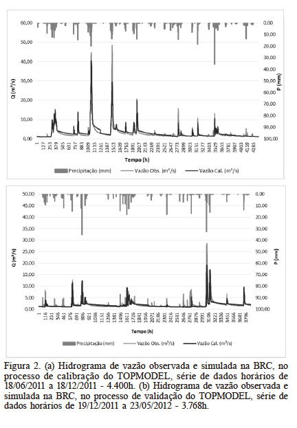 A Figura 2 apresenta o hietograma e os hidrogramas da vazão observada e simulada na BRC, na calibração (Figura 2a) e validação (Figura 2b) do TOPMODEL.