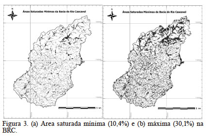 Às áreas saturadas na bacia variaram de 10,4% da área total da bacia (saturação mínima) a 30,1% (saturação máxima).