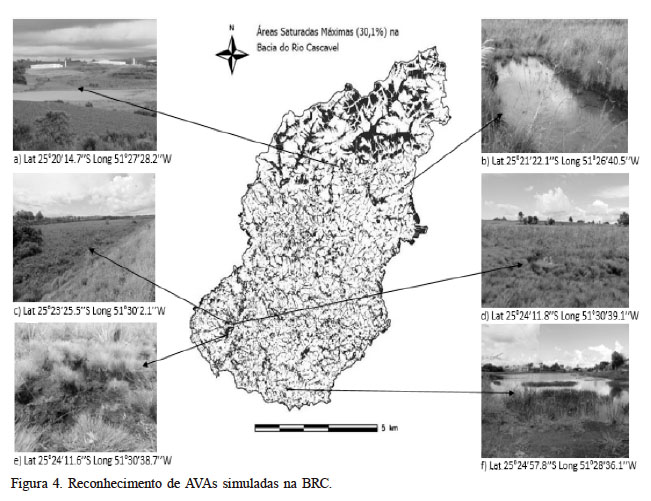 De modo geral, constatou-se coerência entre as AVAs simuladas e áreas saturadas na BRC. Na Figura 4 têm-se fotografias de AVAs mapeadas na BRC. Elas são caracterizadas por áreas alagadas; presença de vegetação hidrófila e herbácea, típica de regiões úmidas (Figuras 4ªe 4f); banhados; solos hidromórficos (Figura 4c); e turfas (Figuras 4d e 4e)