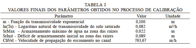 O TOPMODEL no processo de calibração, apresentou bons índices de relação entre a vazão observada e calculada, com coeficiente COE= 0,80 e R²= 0,8765. Na Tabela I são apresentados os valores de cada parâmetro obtidos no processo de calibração.