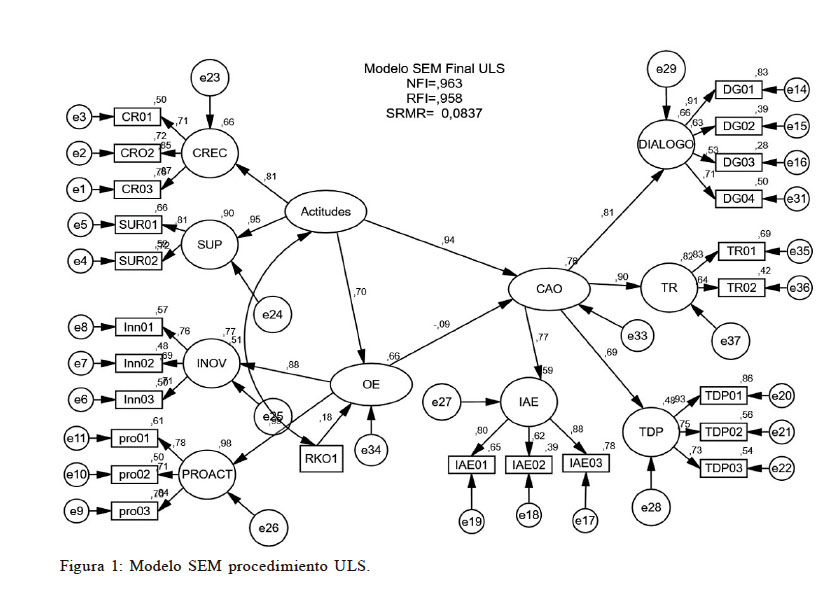 A continuación, se presenta el modelo de estructura que relaciona las variables exógenas AE y OE con la variable endógena CAO (Figura 1). El primer paso de la validación del modelo es analizar su ajuste general, y posteriormente, la significancia de sus relaciones. El ajuste general del modelo se presenta en figura, donde se confirma que el modelo SEM con efectos directos se ajusta adecuadamente, pues los indicadores de bondad de ajuste son adecuados (NFI= 0,963; RFI= 0,958; SRMR= 0,0837).