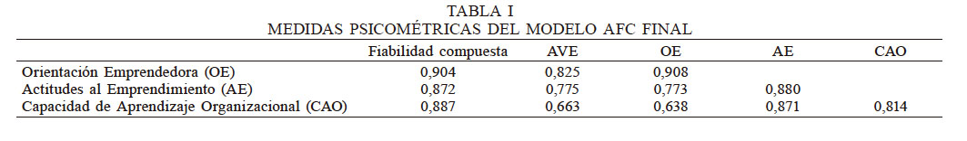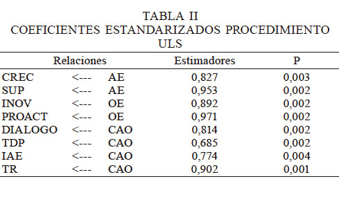 De acuerdo con los resultados obtenidos, la fiabilidad compuesta es >0,70 en todos los casos (Tabla I). Por lo tanto, se cumple la consistencia interna de los factores compuestos OE, AE y CAO. Además, la varianza media extraída (AVE) cumple con valores >0,5. Por lo que se puede indicar que la validez convergente y discriminante es adecuada. En la Tabla II se presentan los coeficientes estandarizados. Los resultados muestran que las cargas estandarizadas son altas y significativas, lo cual garantiza la validez convergente y la ausencia de valores absurdos, tales como cargas factoriales mayores de la unidad.