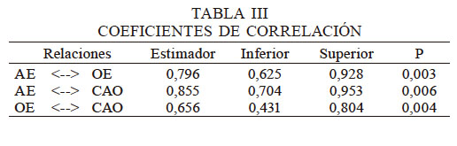 Los resultados evidencian la estimación de los parámetros para las relaciones entre las variables latentes de segundo orden y las relaciones con la variable endógena CAO. Se concluye que el factor AE influye positivamente sobre OE (P=0,001) y CAO (P=0,045), mientras que OE no aporta a explicar CAO (P=0,874).
