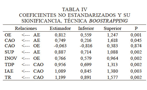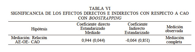 Para definir si la variable latente OE en realidad cumple ese rol mediador se analizó el efecto indirecto con el apoyo de boostrapping. Los resultados se presentan en la Tabla VI. El resultado muestra que el efecto directo estandarizado es significativo (P=0,044), pero que el efecto indirecto estandarizado no lo es, dado que su valor fue de -0,064 (P=0,851). Esto indica que la hipótesis de mediación se cumple de una manera completa (Baron y Kenny, 1986;Kenny, 2004), lo que equivale a exponer que el coeficiente directo es significativo, mientras que el indirecto no lo es.