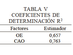 Los coeficientes de determinación (R2) son relevantes en las variables endógenas, en especial el R2 para CAO, pues dicha variable es explicada en un 76,3% por el modelo (Tabla V). La OE es explicada en un 65,7% por las AE (actitudes).