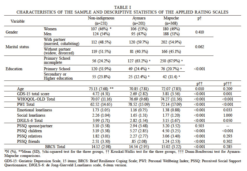 The fundamental features of the sample are set forth in Table I. It is appropriate to highlight average age (72.07 years, SD= 7.81) and the fact that 71% of the sample described themselves as indigenous (35% Aymara and 65% Mapuche). The sample was therefore multiethnic and made up of two indigenous communities (369 Mapuche and 201 Aymara respondents), in addition to participants who were not members of any indigenous ethnic group.
