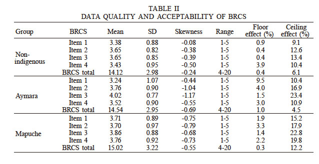 In terms of data quality and acceptability (Table III), there were no missing data and all items showed the full score range. Items did not show skewness except for items 2 and 3 in the Aymara group. No item showed a floor effect, but items 2 and 3 in the Aymara group and all items in the Mapuche group showed a ceiling effect.