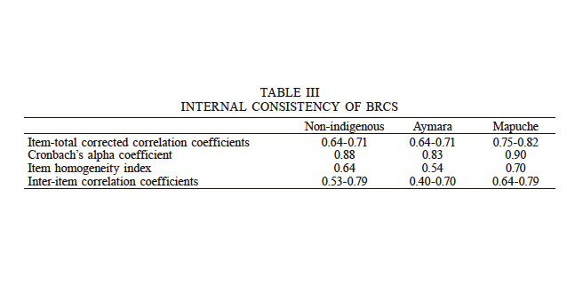 The internal consistency of the BRCS was satisfactory for all three ethnic groups, with all indices above the standard criteria, though slightly higher for Mapuche. Rasch analysis also showed that the scale has a good reliability level for group comparisons. Previous studies have reported similar or even lower Cronbach’s alpha coefficients (Sinclair and Wallston, 2004; Cosco et al., 2016;Rodríguez-Rey et al., 2016).