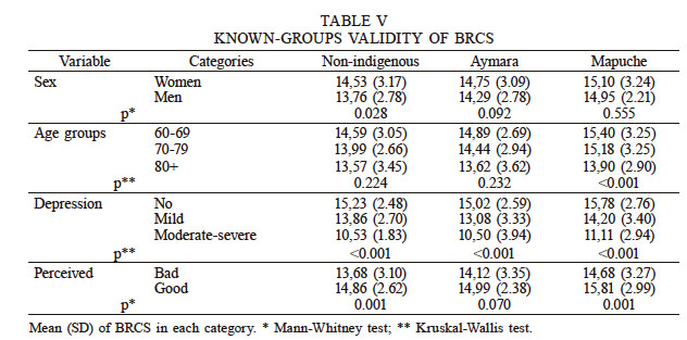 Women had higher BRCS scores than men, although the differences were only significant in the non-indigenous group. By age group, younger participants (60-69 years old) reported higher scores than people aged ≥80, but in this case the differences were only significant in the Mapuche group. People with depression and reporting poor perceived health status scored significantly lower in the BRCS across all three ethnic groups, except in the case of BRCS scores by perceived health in the Aymara group.