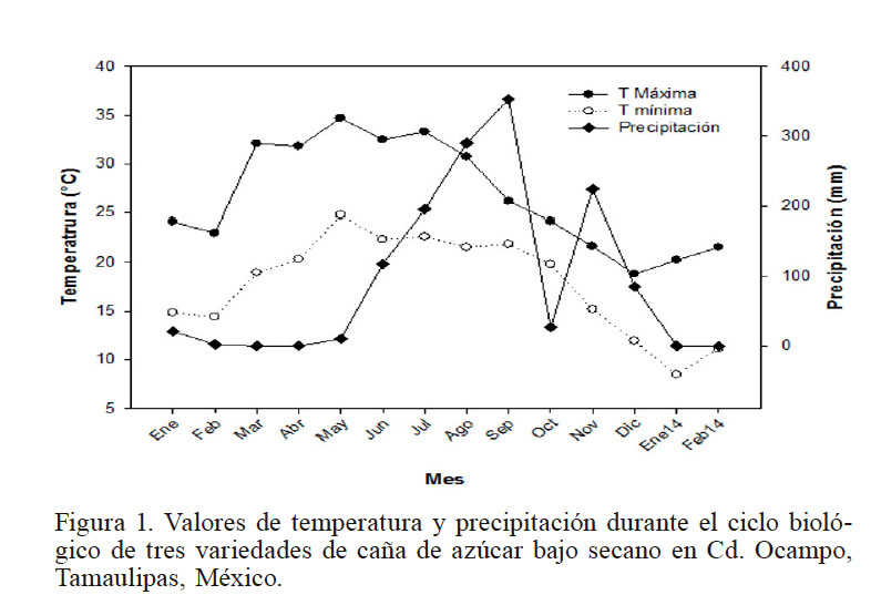 Se estudiaron tres variedades comerciales de caña: Mex 68 P-23, CP72-2086 y Mex 79-431. Estas variedades se seleccionaron por su alto rendimiento en sacarosa, pero ellas difieren en relación al período de maduración, amplio rango de características de crecimiento fenotípico y debido a la importancia en superficie sembrada en la región sur de Tamaulipas, bajo condiciones de secano. CP 72-2086 es una variedad de madurez temprana y Mex 79-431 es una variedad de madurez tardía. CP 72-2086 y Mex 68 P-23 tienen un buen amacollamiento (Flores, 2001). La fertilización se realizó a la siembra siguiendo las recomendaciones locales basadas en las pruebas de suelo realizadas por el ingenio azucarero. Las malezas se controlaron con herbicidas (ametrina + 2,4-D en dosis de 4lxha-1) durante el experimento con el fin de minimizar el estrés biótico por la competencia de malezas. Las enfermedades y los insectos no fueron controlados porque las poblaciones estaban por debajo de los umbrales económicos. Todas las otras prácticas de manejo del cultivo fueron similares a los predios comerciales en la zona. La siembra se realizó utilizando semilla ciclo planta de cada cultivar en surcos a 1,30m de separación el 29/11/2012.