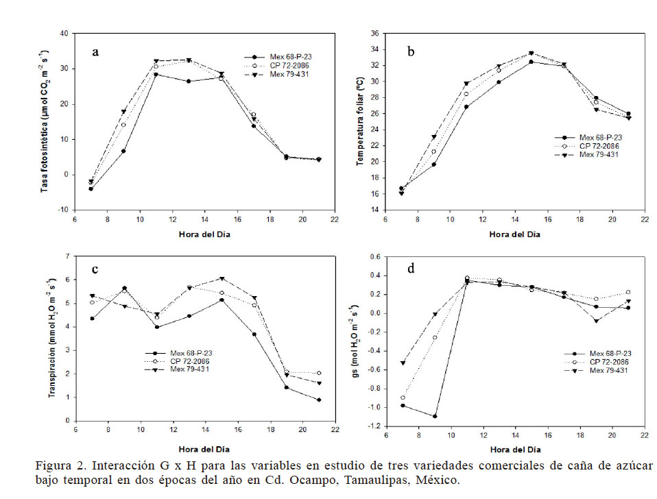 Además, en la Figura 2a se muestra la A de las variedades estudiadas durante el día, se observa una inestabilidad entre las 13:00 y 15:00, principalmente de la variedad Mex 68 P-23. Las variedades Mex 79-431 y CP 72-2086 mantuvieron un comportamiento muy similar entre sí durante todo el día y la A más alta y estable hacia el mediodía con promedios de 32.22 y 32,57µmolCO2·m-2·s-1 respectivamente. En las Figuras 2b, c y d se muestran las variables Th, Tr y gs respectivamente; en cada una de estas variables se observa un comportamiento de las variedades con la misma tendencia que con la A durante el día, pero con cierto nivel de estabilidad como resultado de la influencia de la temperatura, aunque respondiendo de manera diferente, dependiendo esto de la hora del día y de la variedad. De manera general las variedades Mex 79-431 y CP 72-2086 responden de manera estable durante el día, pero no así la variedad Mex 68 P-23; esta respuesta se asocia principalmente a que la RFA capturada por las plantas no es la misma en el transcurso de las horas del día (Marchiori et al., 2014), respondiendo las plantas con los valores más altos de fotosíntesis al medio día ya que la radiación es mayor que en el resto del día.