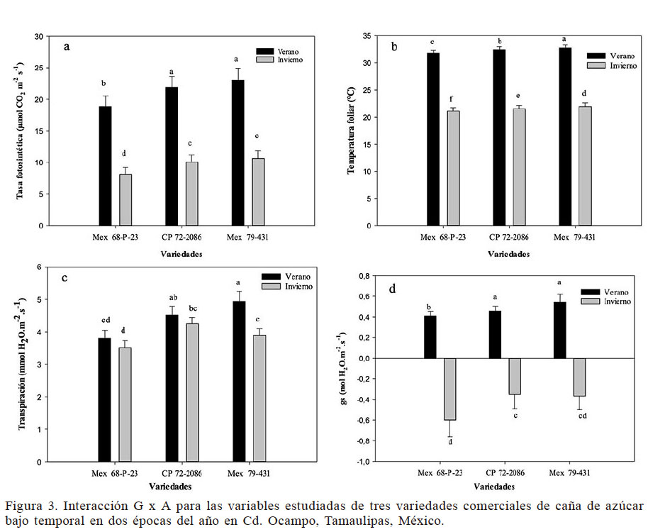 En general, para la A (Figura 3a) se observó que las tres variedades en estudio tuvieron en el ambiente de verano un comportamiento superior (P<0,05) al de invierno; dicha superioridad dependió en gran medida de la variedad, ya que existieron diferencias de hasta 55,8%. La variedad Mex 79-431 tuvo en promedio la mayor tasa fotosintética durante el verano (23,036µmolCO2·m-2·s-1); sin embargo, durante el invierno tuvo un comportamiento similar al de la variedad CP 72-2086, pero diferente a Mex 68 P-23. La disminución de la tasa fotosintética en invierno es atribuible principalmente a la reducción de la temperatura del aire (Figura 1), ya que es severamente reducida en condiciones en las que la temperatura es más baja que el óptimo (Inman-Bamber et al., 2010). En la Figura 3d se observa que para la g. en el ambiente de verano las variedades Mex 79-431 y CP 72-2086 tuvieron un comportamiento similar y superior a Mex 68 P-23; para invierno las variedades tuvieron un comportamiento similar al verano, en promedio la g. fue similar para las variedades Mex 79-431 y CP 72-2086 aunque con valores negativos, siendo la más afectada la variedad Mex 68 P-23. Ello indica que los estomas estuvieron cerrados, principalmente durante las primeras horas del día, lo cual se vio reflejado en una A muy baja, comportamiento encontrado también por Brugnoli y Lauteri (1991). Para la T. (Figura 3b) se observa que las variedades CP 72-2086 y Mex 79-431 tuvieron un comportamiento similar en las dos épocas del año, con una T. más alta durante el verano; en ambos ambientes la variedad Mex 68 P-23 tuvo la menor Th. Esto demuestra que las variedades CP 72-2086 y Mex 79-431 se adaptan mejor a las condiciones ambientales de la zona ya que tuvieron un mejor comportamiento comparado con Mex 68 P-23 en la A tanto en verano como en invierno. Esta respuesta entre genotipos se atribuye principalmente a las características genéticas propias de cada variedad, las que responden de manera diferente al ambiente.