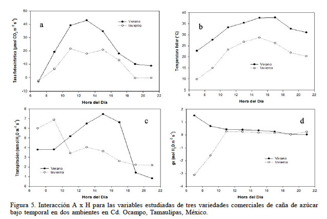 La interacción A x H fue altamente significativa (P<0,001) para todas las variables estudiadas. En la Figura 5a se observa que la A en invierno se redujo significativamente durante todo el día. Como era de esperarse, la A más alta se alcanzó al mediodía (42,9µmolCO2·m-2·s-1) durante el verano, como resultado de una mayor radiación. A partir de las 13:00 y hasta las 15:00, la A fue 40% menor que la obtenida en verano. La variedad Mex 79-431 tuvo la A más alta (46,39µmolCO2·m-2·s-1) a esa misma hora del día (13:00). En la Figura 5b se aprecia una reducción de la Th durante todo el día hasta de 12,8°C mientras que en verano fue de solo 5°C. En la Figura 5c se observa que la transpiración en invierno fue inestable en las primeras horas del día; a partir de las 11:00 y hasta las 15:00 la transpiración fue 54% menor que la transpiración obtenida en verano. En la Figura 5d se indica que en invierno, a partir de las 7:00 y hasta las 11:00 los estomas de la variedades estudiadas estuvieron cerrados; sin embargo, el resto del día estuvieron abiertos para el intercambio de gases, aunque en menor proporción que durante el verano, ya que en esta última época durante todo el día los estomas estuvieron abiertos, como resultado del nivel de humedad en el suelo y la temperatura del aire. De manera general el efecto de las condiciones ambientales en invierno se vio reflejado en una reducción del intercambio de gases como se muestra en la Figura 5, atribuido principalmente a la reducción de la temperatura del aire (Du et al., 1999).