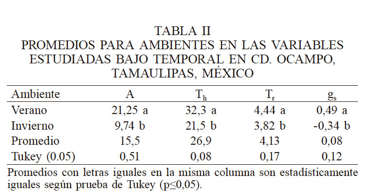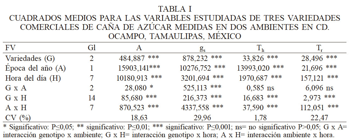 El ambiente influyó en el comportamiento de la caña de azúcar; las variables de intercambio de gases cambian de un ambiente a otro durante el día y el año y depende de la variedad. En la Tabla II se observa que para el invierno la A se redujo significativamente (54%) en relación al verano, debido principalmente a la cantidad de radiación fotosintéticamente activa (RFA) interceptada por las hojas (Monteith y Unsworth, 1990), lo cual confirma que el primer efecto de una baja disponibilidad de la radiación visible es una reducción de la fotosíntesis y el aporte de fotoasimilados (Hashemi-Dezfouli y Herbert, 1992) y una reducción para las variables gs, Th y Tr (170, 33 y 14% respectivamente). Estos resultados permiten deducir que el ambiente está directamente relacionado con la respuesta de las variedades estudiadas, principalmente por el efecto de la temperatura, como lo demostraron Kubien et al. (2003).