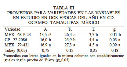 La variedad Mex 79-431 tuvo en promedio la A más alta (16,9µmolCO2·m-2s·-1) con respecto a las otras variedades (Tabla III). Superó en 5,5% a CP 72-2086 (16,0µmolCO2·m-2·s-1) y en 25% a Mex 68 P-23 (13,5µmolCO2.m-2·s-1). Esta respuesta fue similar para la variable Tr (27,3°C); sin embargo, para las variables Tr y gsla variedad Mex 79-431 tuvo una respuesta similar (P>0,05) a la variedad CP 72-2086 pero diferente (P<0,05) a la variedad Mex 68 P-23. Los resultados permiten asumir que la variedad Mex 79-431, con mayor A, tendría la capacidad de producir más biomasa y por lo tanto mayor rendimiento económico, como lo señalan Mabrouk et al. (1990); sin embargo, esto no fue así ya que la tendencia indica que la variedad de mejor rendimiento económico fue Mex 68 P-23, aunque estadísticamente similar a CP 72-2086. Esto podría ser atribuido a que se tuvo la misma densidad de población y el mismo manejo del cultivo. Al respecto Williams et al. (1965) mencionan que el rendimiento máximo de un cultivo es una función directa de su IAFo (cantidad de follaje requerido para interceptar 95% de la radiación incidente), el cual está determinado por la densidad de población.