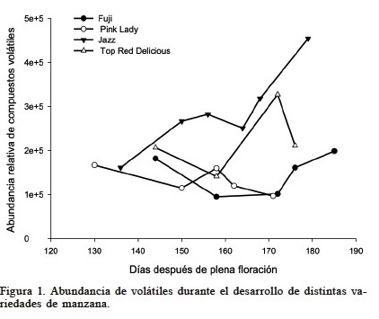 En la Figura 1 se puede apreciar la abundancia de volátiles a través del desarrollo del fruto en el árbol. La variedad Jazz fue la que presentó mayor contenido de compuestos volátiles a los 185 ddpf, mientras que la variedad Pink Lady presentó la menor abundancia relativa de compuestos volátiles a los 170 ddpf, lo cual puede estar relacionado con la producción de etileno, ya que éste es un factor limitante para la producción de aquellos compuestos volátiles que dependen del etileno en la fruta cosechada (Song y Bangerth, 1996).