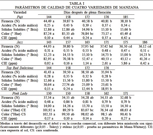 La Tabla I muestra la evolución de parámetros de calidad de las cuatro variedades de manzana analizadas en este estudio. Se puede observar que la variedad Fuji presenta los valores más altos de firmeza en la fecha de cosecha comercial (185 ddpf). Varias investigaciones indican que la firmeza de la fruta es uno de los principales parámetros de aceptación por parte del consumidor (Daillant-Spinnler et al., 1996).