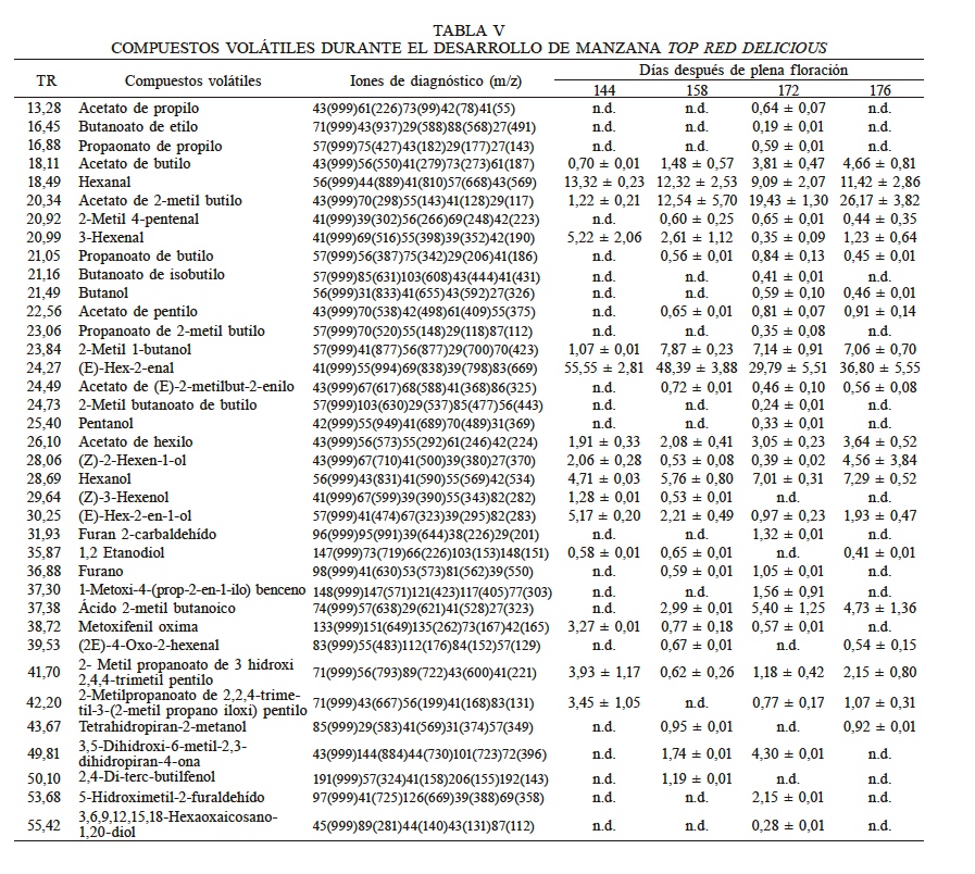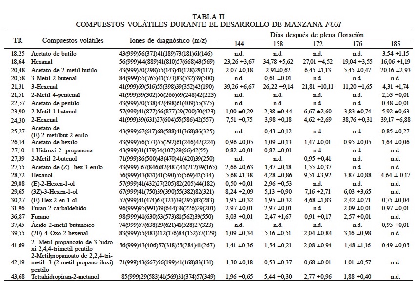 La Tabla II muestra los compuestos volátiles encontrados en la variedad Fuji, siendo un total de 25, los cuales fueron 7 aldehídos, 6 ésteres, 8 alcoholes, 1 cetona y 3 ácidos carboxílicos. Los ésteres que se presentaron en mayor abundancia al momento de la cosecha, fueron el acetato de 2-metilbutilo, el acetato de butilo y el acetato de hexilo, los cuales se encuentran dentro de los que contribuyen al perfil del aroma de la manzana Fuji (Lara et al., 2006).