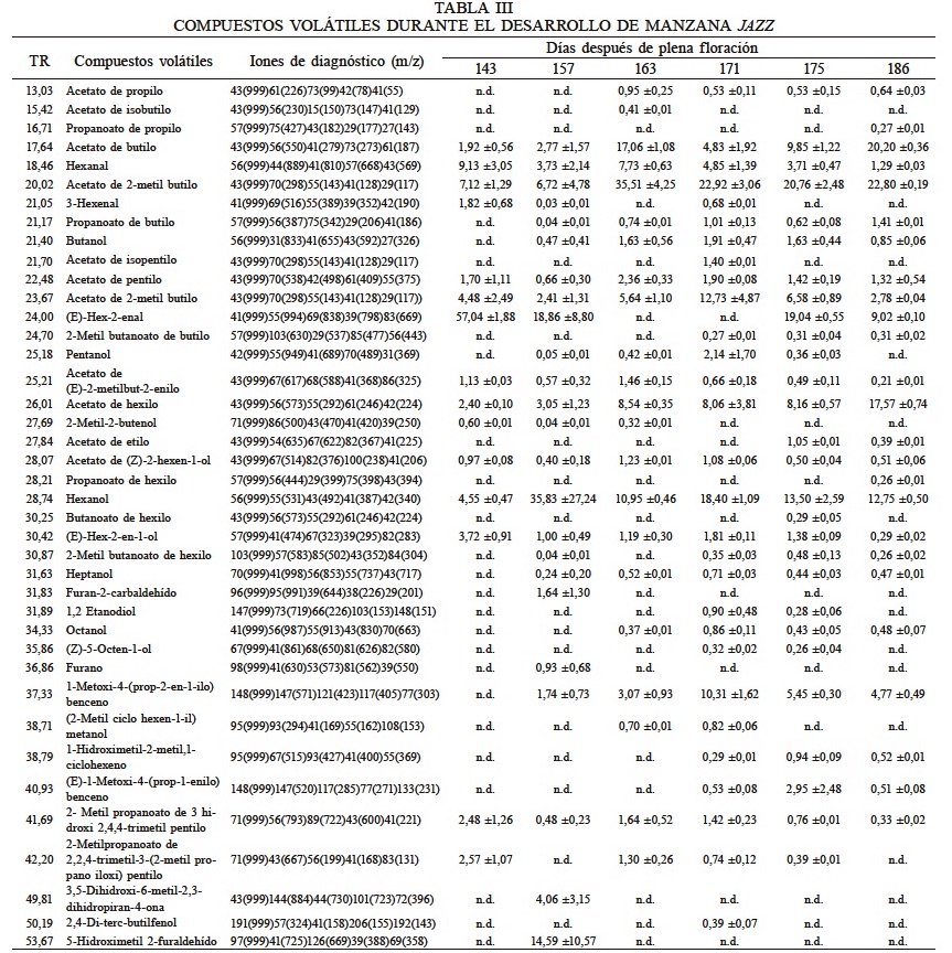 En la Tabla III se muestra los compuestos volátiles encontrados en la variedad Jazz, siendo un total de 41, que fueron 17 ésteres, 12 alcoholes, 4 aldehídos, 2 ácidos carboxílicos, 1 cetona, 1 éter, 1 fenol y 1 diol. Esta fue la variedad que presentó una mayor diversidad de compuestos volátiles, y entre estos los de mayor abundancia fueron acetato de 2-metilbutilo, acetato de butilo, acetato de hexilo, hexanol y (E)-2-hexenal.