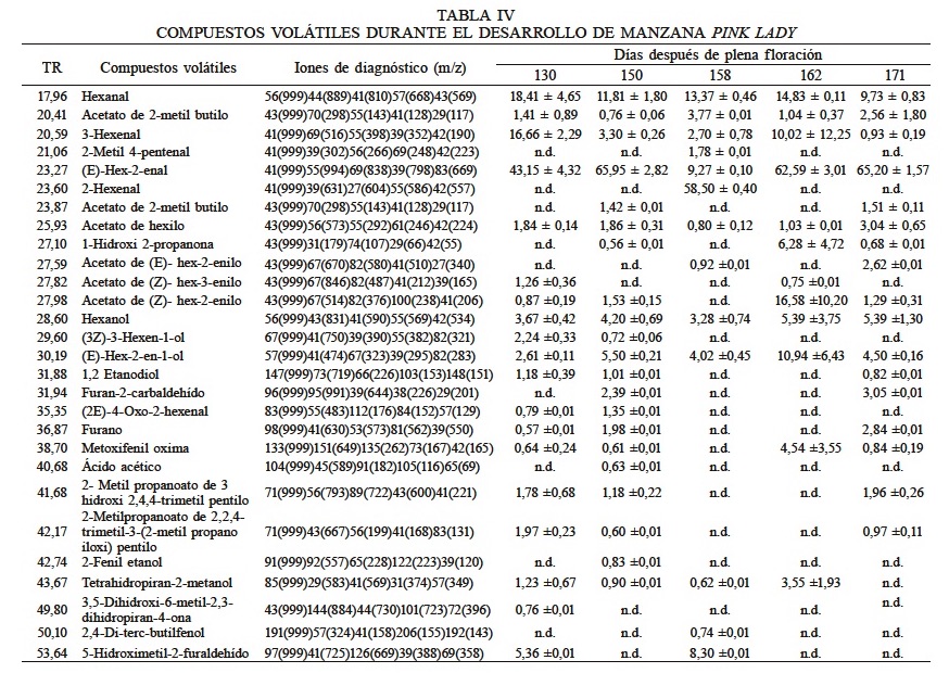 La Tabla IV muestra un total de 27 compuestos volátiles encontrados en la variedad Pink Lady, que fueron 5 ésteres, 9 alcoholes, 8 aldehídos, 2 ácidos carboxílicos, 3 cetonas, 1 diol y 2 éteres. El acetato de hexilo fue el éster más abundante al momento de la cosecha, seguido por el acetato de 2-metilbutilo, habiendo sido ambos reportados como importantes para la aceptación de la manzana Pink Lady (López et al., 2007).