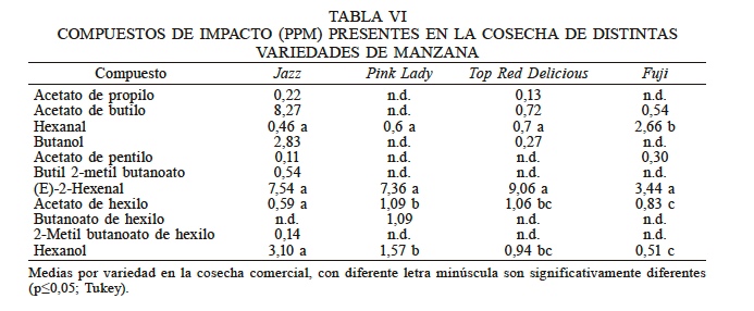 La Tabla VI muestra las concentraciones de los compuestos impacto en el sabor encontrados en las variedades de manzana analizadas. Se observa que la variedad que presentó más de estos compuestos descritos como de impacto en el sabor fue la Jazz con diez compuestos, a diferencia de la Pink Lady que solo presentó cinco. También se observa que los cuatro compuestos que se presentaron en todas las variedades fueron el hexanal, el 2-hexenal, el acetato de hexilo y el hexanol, los cuales han sido descritos con aroma afrutado. El hexanal y el 2-hexenal aportan un sabor intenso a verde (Rizzolo et al., 1989), el acetato de hexilo ha sido descrito con aroma afrutado (Dimick y Hoskin., 1983) y el hexanol por su parte tiene olor a fresco, verde (Mehinagic et al., 2006).