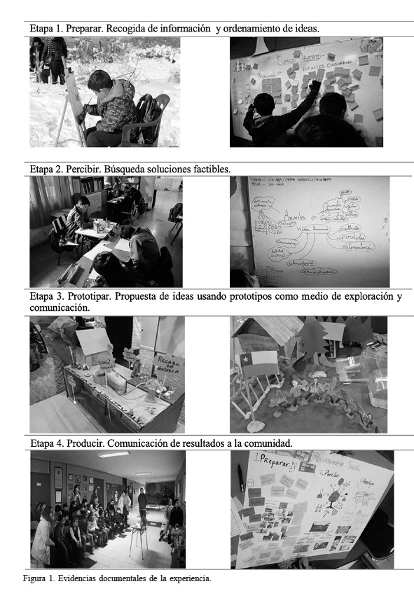 c) Implementación. Uno de los investigadores explicó a estudiantes y docentes el objetivo y dinámica de la experiencia, la que se realizó acorde a las cuatro etapas o fases del modelo Compass: Preparar, Percibir, Prototipar y Producir. En la fase 1-Preparar, los estudiantes fueron organizados en dos equipos distribuyendo roles y responsabilidades. Mediante lluvia de ideas detectaron oportunidades o problemáticas existentes en su entorno inmediato y exploraron los recursos disponibles para concretar un desafío que mejoría la calidad de vida de su comunidad. Diseñaron e implementaron un plan de recogida de datos, estructurado en entrevistas aleatorias a integrantes del entorno. Las visitas a terreno y el levantamiento de información se llevaron a cabo mediante método de bocetos, fotos y videos diarios. De regreso en el aula, esta información permitió a los estudiantes entablar diálogos, haciendo uso del material gráfico como elemento de análisis. La decisión y elección final respecto de qué desafío enfrentar, se basó en el nivel de impacto que las mejoras podrían tener en la vida de las personas. Los desafíos seleccionados fueron un sistema de recolección y tratamiento de residuos y un sistema de cultivo de hortalizas. En la fase 2-Percibir se realizó una descripción detallada de ambos desafíos y sus usuarios, buscando soluciones factibles. Herramientas tales como interpretación de roles y ‘pruébelo usted mismo’, permitieron a los estudiantes adoptar el lugar de otros y experimentar sus vivencias. Se hicieron expertos en su entorno y empatizaron con las necesidades y expectativas de su comunidad. Esta etapa permitió definir requerimientos, proponer mejoras y cambios para integrar nuevos valores a las soluciones existentes. El equipo cuyo tema es el sistema de recolección y tratamiento de residuos aplicó matemáticas para definir el costo total del proyecto, considerando transporte, recolección, posibilidades para el reciclaje, observando minimizar impactos ambientales. El equipo encargado del sistema de cultivo de hortalizas revisó costos de mejoramiento de los sistemas de cultivo existentes, aprendió sobre especies y sus condiciones de crecimiento, y realizó una propuesta con mejoras de las condiciones de viveros y los costos implicados. En la etapa 3-Prototipar, los estudiantes propusieron ideas variadas para resolver los desafíos, desarrollaron prototipos de baja fidelidad para visualizar soluciones concretas en tres dimensiones, iterando en la búsqueda de soluciones (Douglas, 2014). Finalmente, en la etapa 4-Producir, los equipos terminaron el producto para que pudiera ser comunicado. Los procesos desarrollados y las soluciones diseñadas se presentaron a docentes, investigadores y representantes de la comunidad para ser evaluados y recibir retroalimentación.