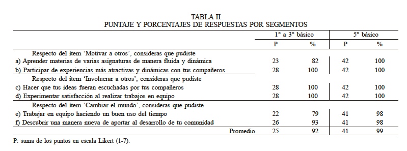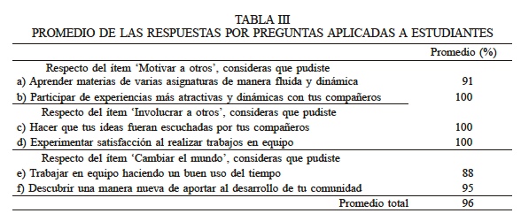 Del estudio 1 (Tabla II), las respuestas vertidas por el segmento de 1° a 3° año básico respecto del ítem ‘Motivar a otros’, dejan ver que la consulta a) tuvo un 82% de respuesta positiva, mientras que las respuestas para b) obtuvieron un 100% de aprobación. En la actividad de grupo focal los estudiantes de esta categoría manifestaron haber experimentado cierta dificultad para aportar con ideas, debido a su desconocimiento respecto de ciertas materias. De cualquier modo, manifestaron que la experiencia fue positiva, pues supone para ellos un desafío superior. Los estudiantes de 5° año atribuyeron un 100% a las respuestas para las consultas a), b), c) y d). Para las preguntas e) y f) las respuestas tuvieron un 98% de aceptación. En el grupo focal los estudiantes manifestaron que, en esta primera experiencia de integración, les había sido complejo acostumbrarse a trabajar en equipos de diversas edades. Declararon que el manejo del tiempo fue complicado, debido a que se requiere adaptación a las condiciones del trabajo en cuanto a lo nuevo de la actividad y diversidad etaria de los integrantes. Podemos encontrar para la letra e) la menor puntuación, 22 de 28 posibles; sin embargo, todas ellas se encuentran en altos rangos, lo que se evidencia en los porcentajes de valoración positiva. Como resultado general basado en los promedios de las respuestas por pregunta aplicada a estudiantes (Tabla III), se puede observar que b), c) y d) tienen un promedio del 100% de respuestas postivas; mientras que e), tiene la menor valoración con un 88%. Sin duda, entrenarse en el trabajo en equipo, es un requerimiento indispensable para incrementar las valoraciones referidas a la implementación de la metodología.
