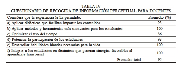 En el estudio 2, las docentes expresan para los aspectos consultados (Tabla IV), respuestas con un 100% de aprobación para las consultas b), e) y f). La menor valoración es de 86% y corresponde a la pregunta c), seguida con un 93% por las respuestas atribuidas a las preguntas a) y d).