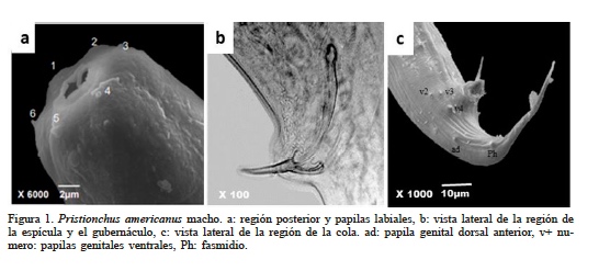 Macho. La cutícula es anillada, con estrías longitudinales. La cabeza es ligeramente redondeada y presenta seis papilas labiales (Figura 1a). El estoma es ancho y asimétrico, en el metastoma se observa una elevación dorsal sobre la que se asienta un diente en forma de garra. El esófago presenta un procorpus cilíndrico y musculoso que ocupa dos tercios del diámetro del cuerpo, el metacorpus es muscular de forma ovoide, el istmo es alargado, estrecho y no muscular, el bulbo basal es de forma glandular, el anillo nervioso está rodeando el istmo a media región. El poro excretor se ubica en la porción media del esófago. Presenta una espícula en forma de hoz estrecha y el gubernáculo es delgado y similar en su forma a la espícula (Figura 1b). Se observan siete pares de papilas genitales distribuidas en la siguiente forma: dos pares precloacales y seis post cloacales. La cola es de forma cónica que se adelgaza progresivamente hasta terminar en forma de látigo (Figura 1c).