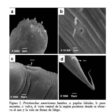 Hembra. El cuerpo es largo y grueso. Son similares al macho, pero son más grandes en longitud. La cutícula es delgada y finamente anillada, presentan estriación longitudinal a lo largo de todo el cuerpo. La cabeza es ligeramente redondeada, la región anterior tiene seis papilas labiales (Figura 2a), cuatro papilas cefálicas y una abertura anfidial elíptica. El estoma ancho y asimétrico, en el metastoma se asienta un diente en forma de garra. El poro excretor se ubica en la parte media del esófago (Figura 2b). Son didélficas, anfidélficas, presentan endotoquía matricida. La vulva se encuentra entre el 45-52% de la longitud total del cuerpo (Figura 2c). La cola es de forma cónica que se adelgaza progresivamente hasta terminar en forma de látigo (Figura 2d).
