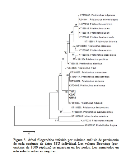 El análisis filogenético basado en la región SSU (Figura 3) mostró que las secuencias se agruparon entre las especies P. americanus y P. maupasi, pero esta última fue descartada por las características morfológicas como la disposición de las papilas genitales. A además, la especie P. maupasi es un nematodo que presenta hermafroditas (Herrnann, 2006b) a diferencia de las cepas de este estudio que presentan sexos separados; por lo que se confirmó la identidad de la especie.