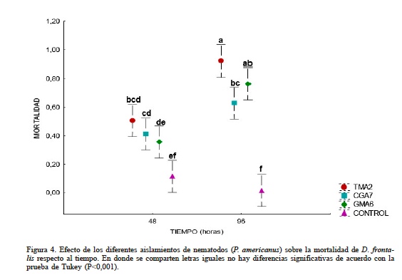 El análisis estadístico indicó un efecto significativo entre la especie del nematodo y su interacción con el tiempo sobre la mortalidad de D. frontalis, con lo cual se puede observar que los aislamientos TMA2 y GMA6 presentaron diferencias significativas sobre la mortalidad a las 48 y 96h, en cambio el aislamiento CGA7 presentó similitud en ambas horas (Figura 4).