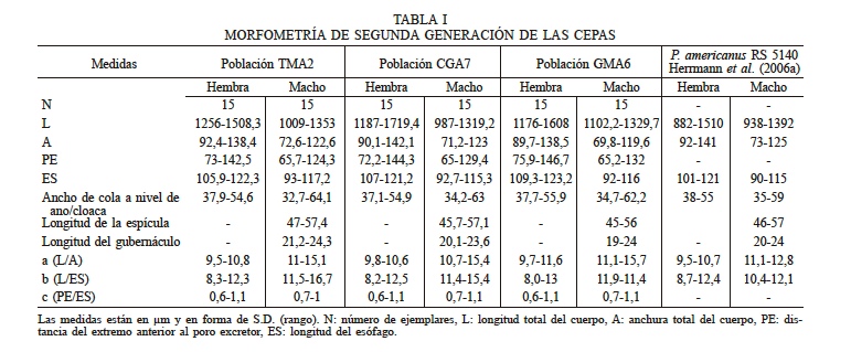 La morfometría de los tres aislados es similar (Tabla I). Para el caso de las hembras la máxima longitud del cuerpo (L) se observó en la población CGA7 con 1719,4µm, seguido de la cepa GMA6 que presentó 1608µm y el aislado TMA 1508,3µm; siendo este último el que presento menor longitud. Con respecto a la distancia del extremo anterior al poro excretor (PE), el aislado GMA6 con una distancia de 146,7µm, 144,3µm para la población CGA7, y TMA2 142,5µm (Tabla I). En relación al ancho de la cola a nivel del ano la población GMA6 presento el mayor valor con 55,9µm; 54,9μm para CGA7, y GMA6 con 54,6μm.