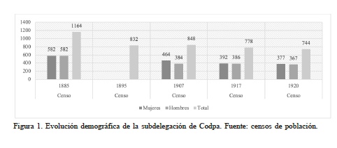 Dentro del repertorio festivo y religioso, sobre todo desde la consolidación de la república peruana, cada exaltación a la Iglesia tuvo un correlato nacionalista. Por esa razón las autoridades chilenas vieron en Indacochea y la feligresía peruano-codpeña un elemento adverso a la ‘chilenización’, buscando atenuar algunas celebraciones por considerarlas contrarias al proyecto nacional, mientras que otras fueron directamente intervenidas con elementos chilenizadores (como la fiesta en honor a San Martín de Tours). Sobre dicha ‘chilenización’ es preciso indicar que se agudizó hacia 1910, justamente desde la expulsión de los curas peruanos, cuando adquirió carácter de política estatal. Con posterioridad, la juventud masculina codpeña fue presionada para hacer el servicio militar, produciendo que varios habitantes abandonasen el territorio. Esa migración forzada, en conjunto con otras dinámicas demográficas y poblacionales, significó un importante descenso poblacional entre 1885 y 1920 (Figura 1).