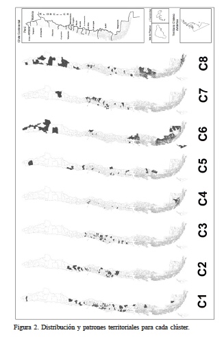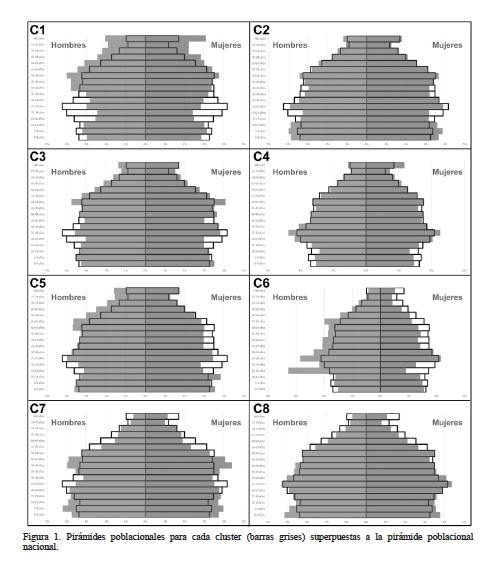 Tomando en cuenta las 346 unidades subnacionales de tercer nivel que componen Chile, es posible afirmar que la estructura poblacional por edad y sexo presentan características heterogéneas entre ellas, las cuales pueden ser agrupadas en ocho clústeres. De manera general, estos matices importantes entre ellos se pueden observar en la Figura 1, a partir de las pirámides superpuestas. La distribución y patrones espaciales en las comunas de tales clústeres se aprecia en la Figura 2. Los indicadores descriptivos de la situación demográfica de cada clúster se muestran en la Tabla I.
