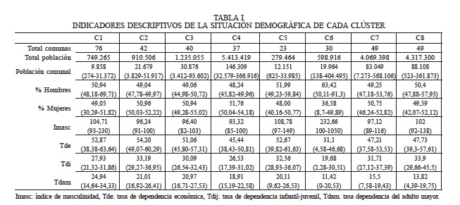 Tras diversas pruebas, fue posible identificar a ocho grupos de comunas similares entre sí, pero distintos entre ellas en términos de su composición poblacional, considerando la variación de medias que presenta cada conglomerado. Tal proceso se llevó a cabo mediante el software estadístico SPSS 25.