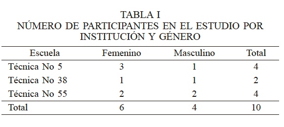 En el estudio se consideró como población a 50 docentes adscritos a las tres escuelas secundarias antes mencionadas, correspondientes a la zona 1 de la Región del Mayo, al Norte de México. La muestra del estudio fue inicialmente de cuatro docentes, pero se extendió hasta lograr la saturación teórica (Lúquez, 2016). Como se muestra en la Tabla I, la muestra final fue de diez docentes y estuvo conformada por educadores de ambos sexos, predominando el sexo femenino.