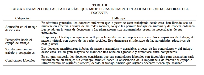 La Tabla II presenta un resumen de los principales hallazgos en cada una de las categorías exploradas. En cuanto a la percepción de los docentes acerca del trabajo desde casa, ocho de ellos indicaron llevar una buena comunicación a través de las redes sociales, realizando reuniones virtuales para la toma de decisiones y acciones que permitan un mejor desempeño docente en bien para los alumnos, donde todos los que conforman la planta docente, planean y están enfocados a cumplir el programa de mejora continua. Dos participantes consideran que no existe una buena comunicación con algunos compañeros de trabajo de la institución, argumentando su dificultad para el manejo de la tecnología.