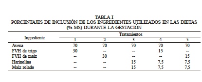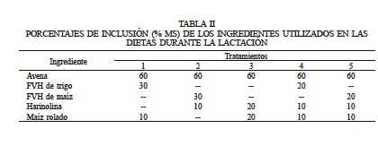 El trabajo experimental se llevó a cabo en las instalaciones de la Facultad de Medicina Veterinaria y Zootecnia de la Universidad Juárez del Estado de Durango (FMVZ-UJED), localizada en el km 11,5 de la carretera Durango-Mezquital, Durango, México. Para el experimento se utilizaron 40 cabras primíparas de raza alpina francesa, mantenidas en un sistema de producción intensivo, con peso promedio de 35,1 ±4kg. Se suministraron cinco dietas experimentales en diferentes porcentajes de inclusión de FVH de trigo y maíz, además de la dieta testigo que consistió en harinolina (cascarilla de algodón) y maíz rolado (Tablas I y II). Los animales fueron distribuídos aleatoriamente en corraletas individuales de 2x1m, ocho cabras por dieta, durante siete meses correspondientes a cinco meses de gestación y dos meses de lactación. Se registró la evolución del peso de los animales cada mes y se midió diariamente el alimento rechazado. Se proporcionó agua y minerales a libre acceso durante todo el proceso.