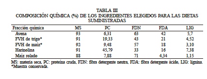 El contenido nutricional de los ingredientes empleados en la dieta (Tabla III) se obtuvo determinando materia seca y proteína cruda con el método de la AOAC (1995), y las fibras detergentes neutra y detergente ácido con el procedimiento de Van Soest et al. (1991).