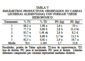 Los parámetros productivos no mostraron diferencias significativas (p=0,68) en la tasa de supervivencia de los cabritos con el tratamiento 1, donde obtuvo el valor más alto de 88%, respecto a la dieta testigo (85,7%), mientras el tratamiento 5 registro el valor más bajo con 62% (Tabla V). En la supervivencia se tomaron en cuenta las muertes de las crías antes de los 100 días, lo que está relacionado con la época de sequía, la alimentación o vacunas, que resultan en decesos de hasta un 30% (Silva et al., 1998). Para este estudio se obtuvieron porcentajes dentro de rangos establecidos para caprinos al norte de México (50-80%; Mellado, 1997).
