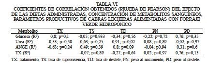 Los coeficientes de correlación (Tabla VI) mostraron que la dieta influenció la concentración sanguínea de glucosa (R2= 0,8). Al comparar la alimentación contra los parámetros productivos, solo se presentó una correlación entre la dieta y el peso al destete (R2= 0,76). Esto puede deberse al soporte energético de las dietas y el estado fisiológico de los animales. Comparando la concentración sanguínea de glucosa, esta no tuvo una relación estadística con parámetros productivos, excepto, con el peso al destete (R2= 0,76). La urea por otra parte, tuvo una buena relación con todos los parámetros, particularmente, la tasa de destete (R2= 0,91), comportándose de manera similar a los AGNE, mostrando buena relación con la tasa de destete (R2= 0,80). Estos resultados reflejan la buena respuesta en el desarrollo de los cabritos, así como un buen aumento de peso de los animales al ser suplementados con FVH.