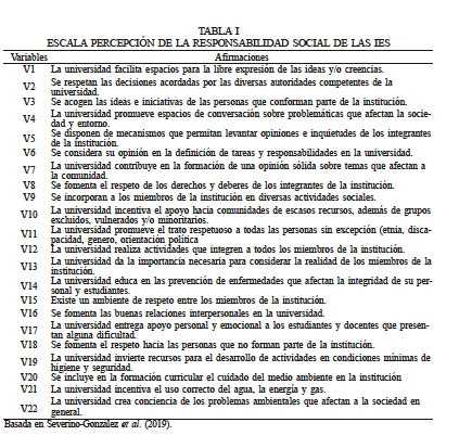 Esa escala compuesta por 22 variables consta de tres secciones: la primera sección incluye preguntas filtro que permiten discriminar según los criterios de inclusión y exclusión de este estudio, la segunda sección está compuesta por afirmaciones que recogen las características sociodemográficas de los estudiantes universitarios, y la tercera sección se compone de una escala que revela la percepción de responsabilidad social, el cual esta expresado en variables a través de afirmaciones; dichas afirmaciones muestran diversos aspectos que integra la responsabilidad social de las IES (Tabla I).