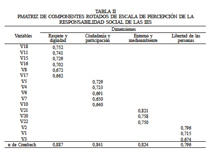 En la Tabla II, se puede identificar la estructuración del análisis factorial exploratorio, cuyos factores se agrupan en cuatro dimensiones, lo que permite describir la responsabilidad social de las IES desde la percepción de los estudiantes universitarios. La solución factorial permite explicar el 69,07% de la varianza total de los datos en relación a las varianzas explicadas por cada una de las dimensiones que construyen el concepto de responsabilidad social de las IES. En este sentido, los resultados del AFE permiten reafirmar que la RSU responde a los compromisos sociales que las IES asumen a favor de los grupos de interés a través de diversas áreas de desarrollo que tienen relación con las funciones sustantivas y, al mismo tiempo, con los impactos que caracterizan cada una de las casas de estudios superiores. En relación a lo indicado, se proponen las siguientes cuatro dimensiones que responden a la realidad de El Salvador.