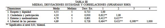 Al establecer las correlaciones entre las dimensiones según el test Spearman Rho, debido a la distribución no normal de los datos tras la aplicación de pruebas de normalidad no paramétrico, se aprecia que todas las correlaciones son positivas y significativas (Tabla III). La mayor asociación es la que se presenta entre las dimensiones Respeto y dignidad y Ciudadanía y participación, la cual es positiva y considerable (r= 0,612), debido a que la implementación de iniciativas que procuran propiciar el respeto y dignidad entre las personas para lo cual es preciso considerar los derechos, deberes y trato respetuosos entre cada uno de los miembros, todo lo cual tiene relación con la disposición de espacios y la promoción de la opinión pública sobre problemas sociales imperantes en los territorios. En cambio, la menor asociación se encuentra entre las dimensiones Entorno y medioambiente y Libertad de las personas, la que es positiva media (r=0,398), lo que se sustenta en la declaración de actividades que buscan motivar el uso responsable de los recursos tras la concientización de los problemas ambientales y tiene conexiones con la inclusión de las diversas opiniones que integran los centros educativos y el respeto por la legitimidad de las decisiones tomadas por las autoridades. Lo señalado permite reconocer que los fututos titulados entregan elementos que constituyen estrategias para el desarrollo de una elevada conciencia social que conduzca al desarrollo de prácticas virtuosas que iluminen a la sociedad gracias a comportamientos que emergen de las competencias socioemocionales, tales como acciones genuinas y no cosméticas, transcendentales y no efímeras, y voluntarias y no forzosas.
