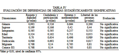 Para el examen de las diferencias entre medias estadísticamente significativas se aplicaron en primer lugar las pruebas de normalidad Shapiro-Wilk y Kolmogorov-Smirnov, para lo cual se tuvo presente el número de observaciones de cada uno de los grupos en correspondencia a las características sociodemográfica. En todos los casos se obtuvo una distribución no normal de los mismos, conduciendo a la exploración no paramétrica de diferencias significativas. Es por ello que se utilizaron las pruebas no paramétricas U de Mann Whitney o H de Kruskal-Wallis para variables independientes, dependiendo de si el conjunto de datos se divide en dos o más muestras. No se encontraron diferencias estadísticamente significativas según las características sociodemográficas relevadas (Tabla IV).